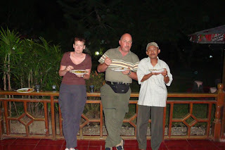 Das abendliche Durchessen von 4 Fischen, auf verschiedene Arten zubereitet, war nicht gerade das, was unseren Vorstellungen entsprach. So zogen wir es vor, am folgenden Abend in einem anderen Restaurant, wo es eine Auswahl ohne Fisch gab, zu schnabulieren. Es war zwar nicht das geeignete Wort, mussten wir doch fast 11/2 Stunden auf das Essen warten. Dabei verging uns fast der Appetit. Was genau das Problem war wussten wir nicht, glauben aber, dass die Koechin zuerst noch einkaufen musste, da sie kurz vor dem Essen mit einem Sack voller Esswaren durch das Restaurant ging. Von der Wirtin wurden wir dann mit einer Portion fritierten Bananen entschaedigt fuer das lange warten. Den letzten Abend, den Corvin mit uns gemeinsam verbrachte, bevor er anderntags weiter nach Kuala Lumpur und somit weiter nach Malaysia weiter reiste, assen wir gemeinsam in einer Garkueche. Das Essen dort war guenstig und gut, halt auch einfach.